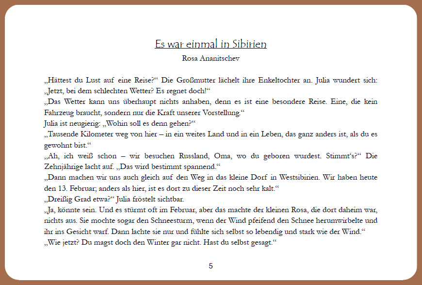 Das neue Buch ist heute eingetroffen – mit spannenden Geschichten und Märchen – nicht nur für Kinder. Meine Enkeltochter mit ihrer Geschichte „Igor kommt ins Krankenhaus“ und ich mit „Es war einmal in Sibirien“ sind auch dabei. Am glücklichsten ist natürlich die Zwölfjährige Julia – und das völlig zu Recht.😊