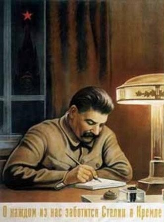 Beitragsbild: Ein Plakat aus den Zeiten der Diktatur. Die russische Unterschrift lautet, wörtlich übersetzt: Für jeden von uns sorgt Stalin im Kreml. [Oh ja!]