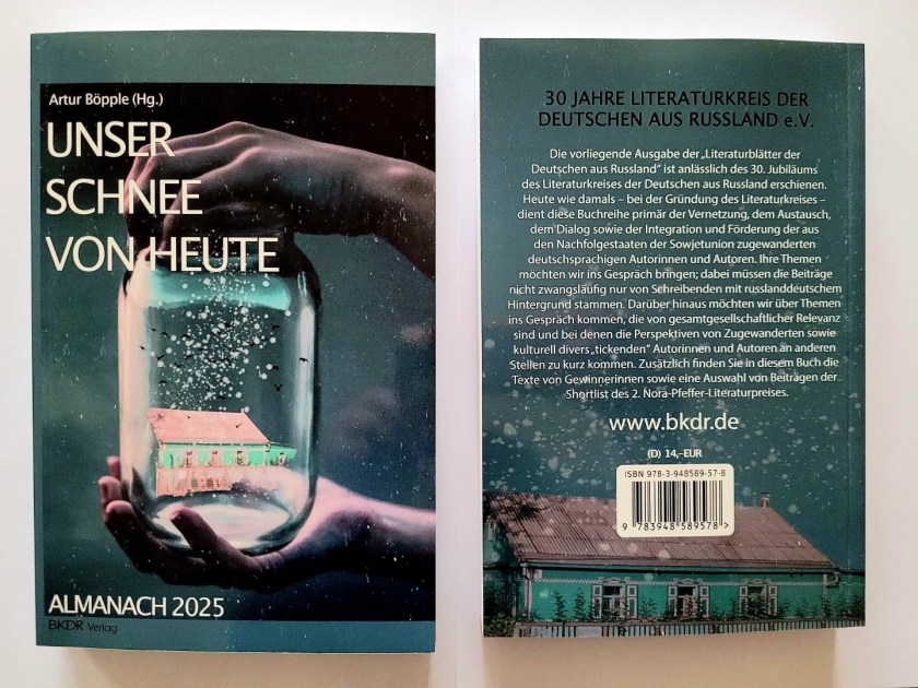 „UNSER SCHNEE VON HEUTE“ heißt der Literaturalmanach 2025 des BKDR Verlags. Er ist anlässlich des 30. Jubiläums des Literaturkreises der Deutschen aus Russland erschienen und enthält Prosa, Lyrik, Essays, Zeitzeugengeschichten und Erinnerungen. Zusätzlich befinden sich im Buch die Texte von GewinnerInnen sowie eine Auswahl von Beiträgen der Shortlist des 2. Nora-Pfeffer-Literaturpreises.